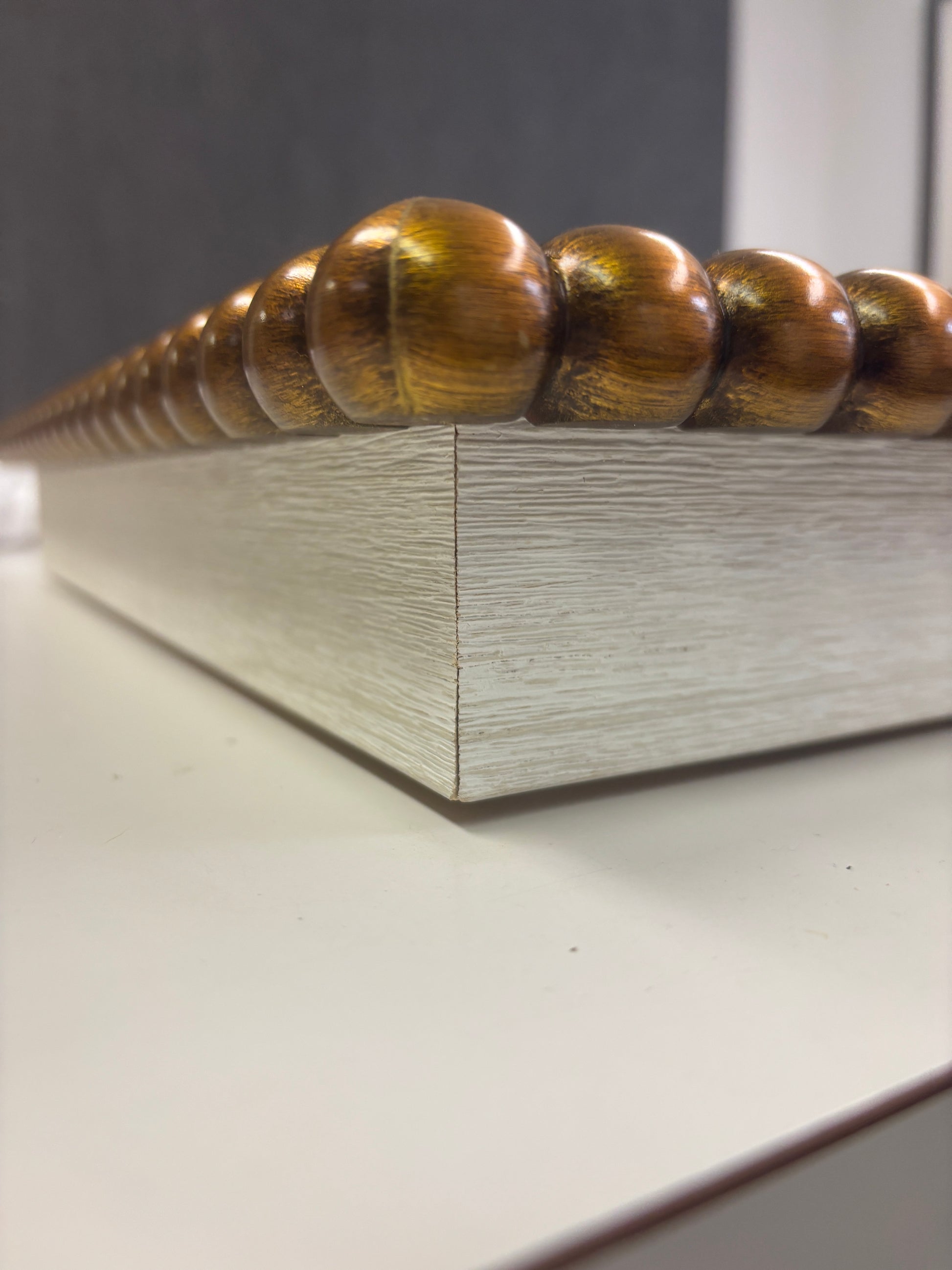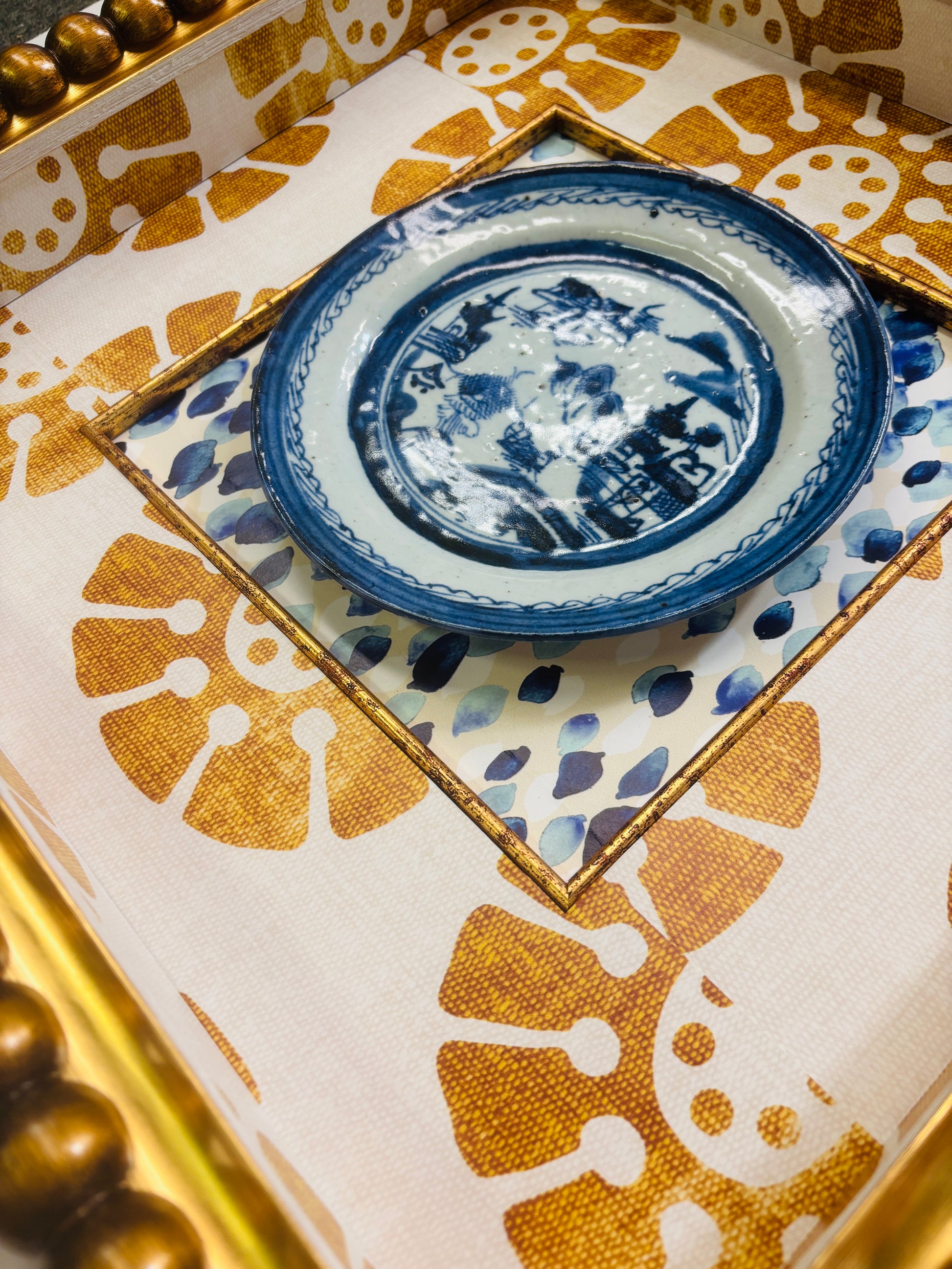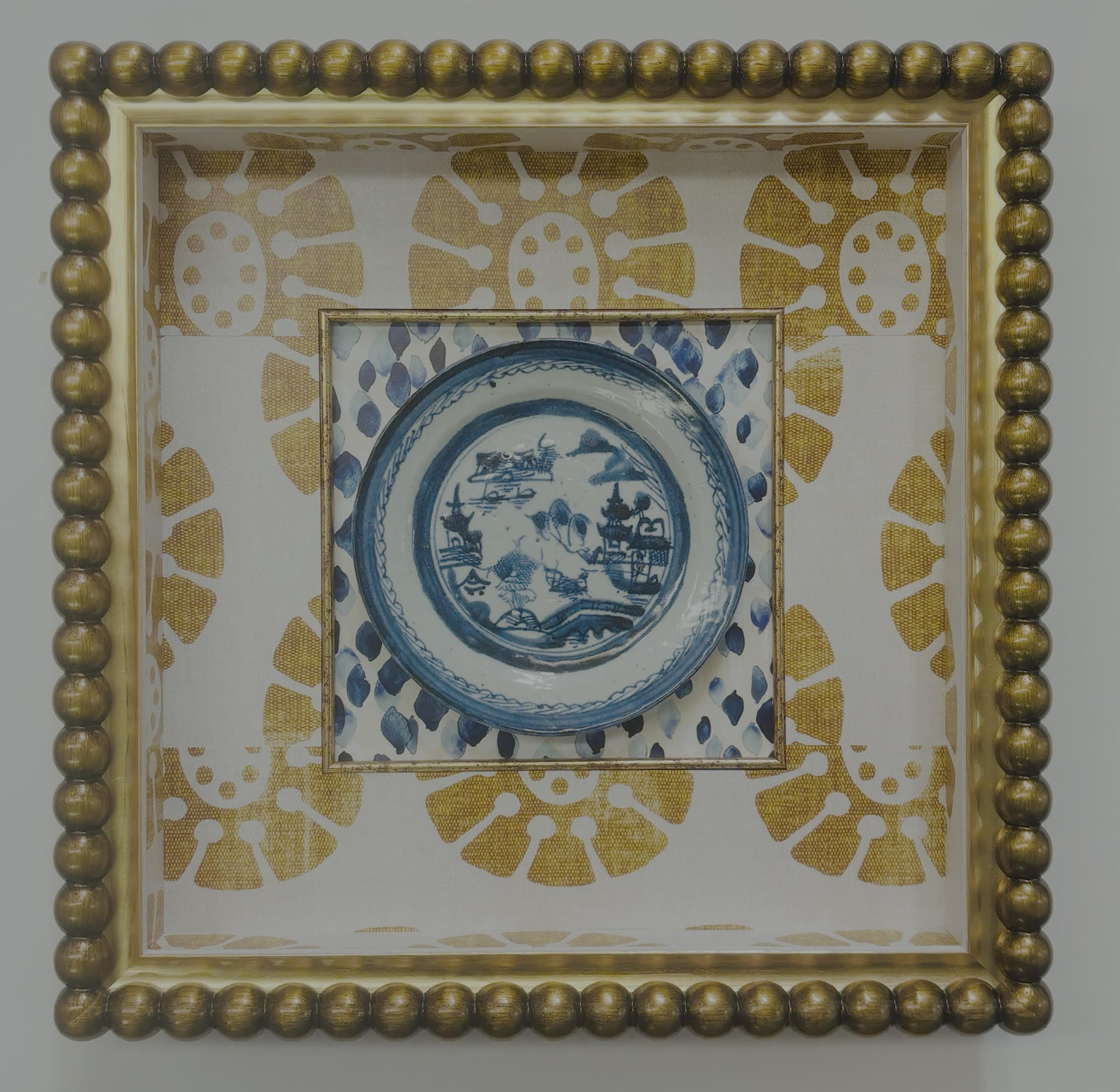 Custom created using this antique Canton plate, a wallpaper matting and combined, stacked mouldings for the framing.