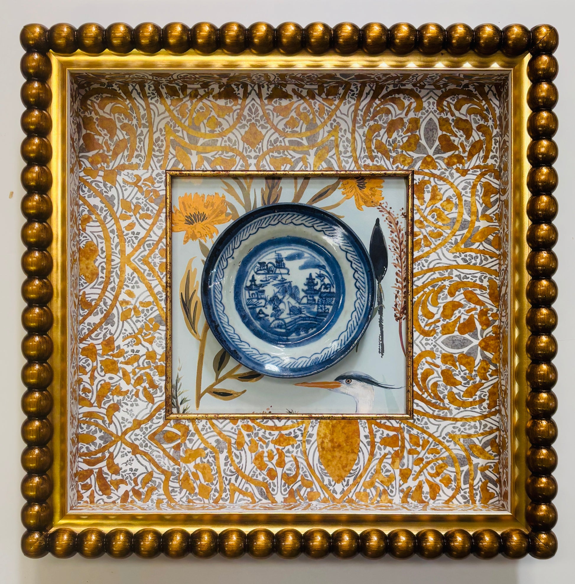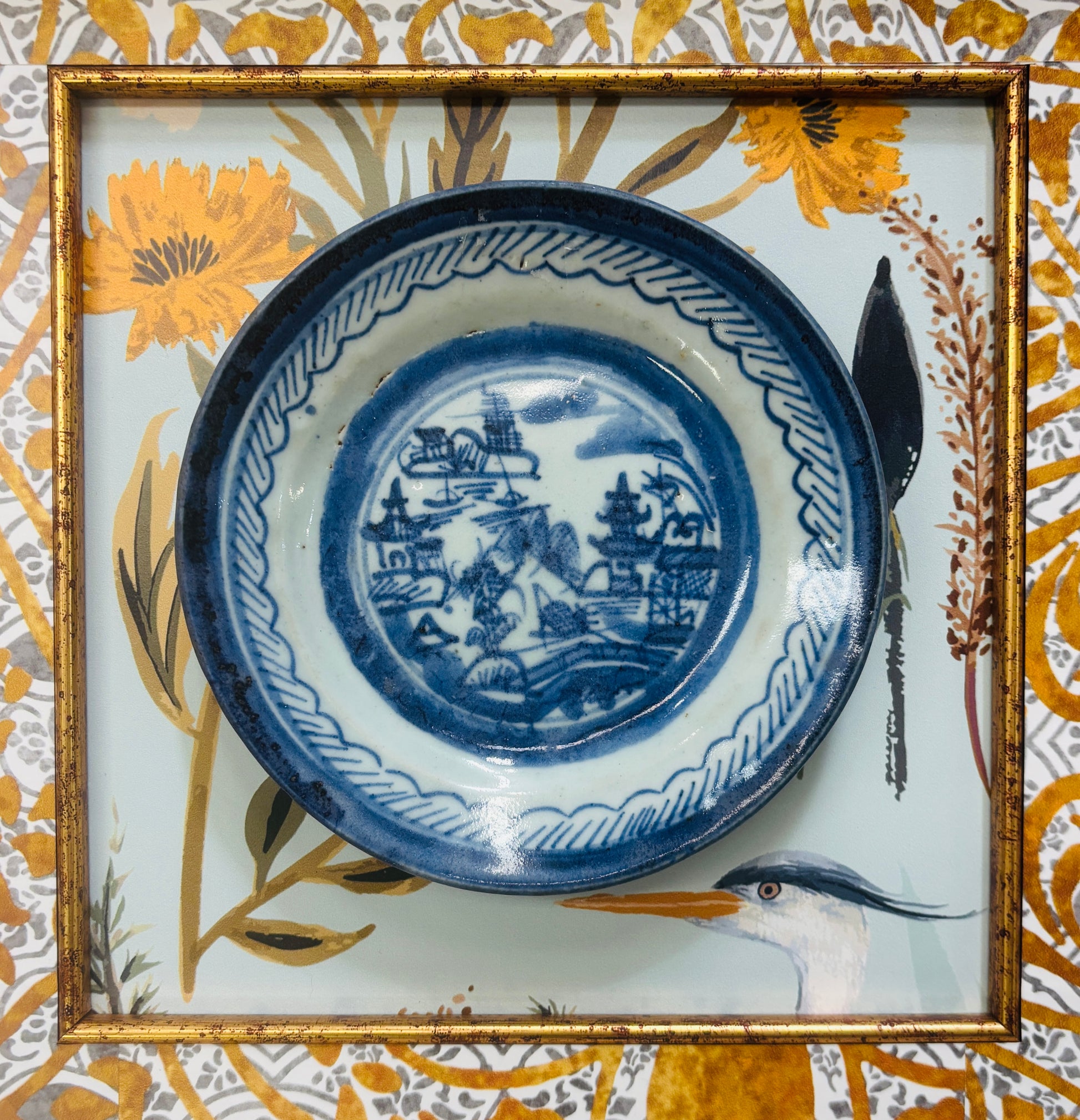 Custom created using this antique Canton plate, a wallpaper/handmade paper matting and combined, stacked mouldings for the framing.