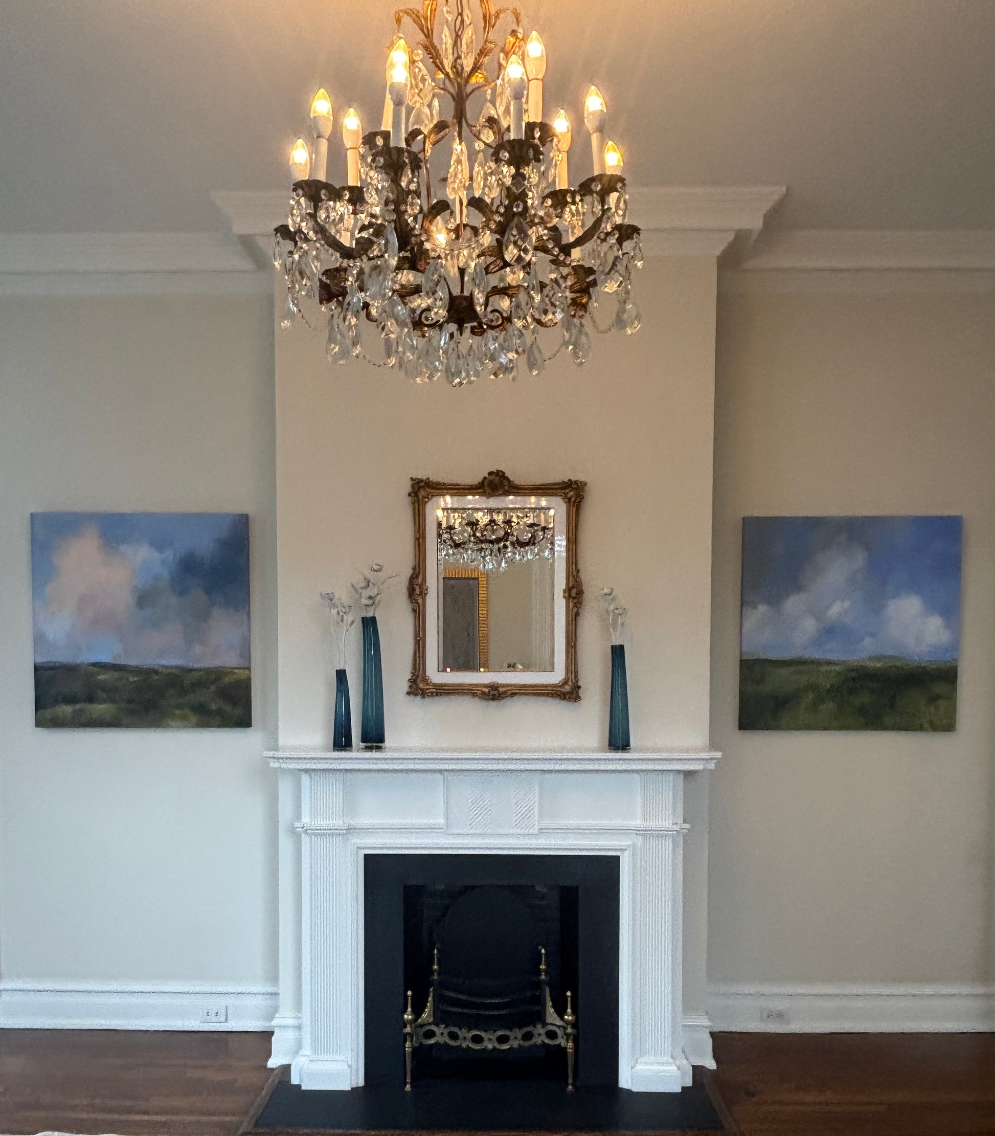 These gorgeous mirrors started with these antique, ornate gold frames. Restored in house and revamped with a modern twist with the addition of crisp white lacquered wood, a beveled mirror and gold fillet.
