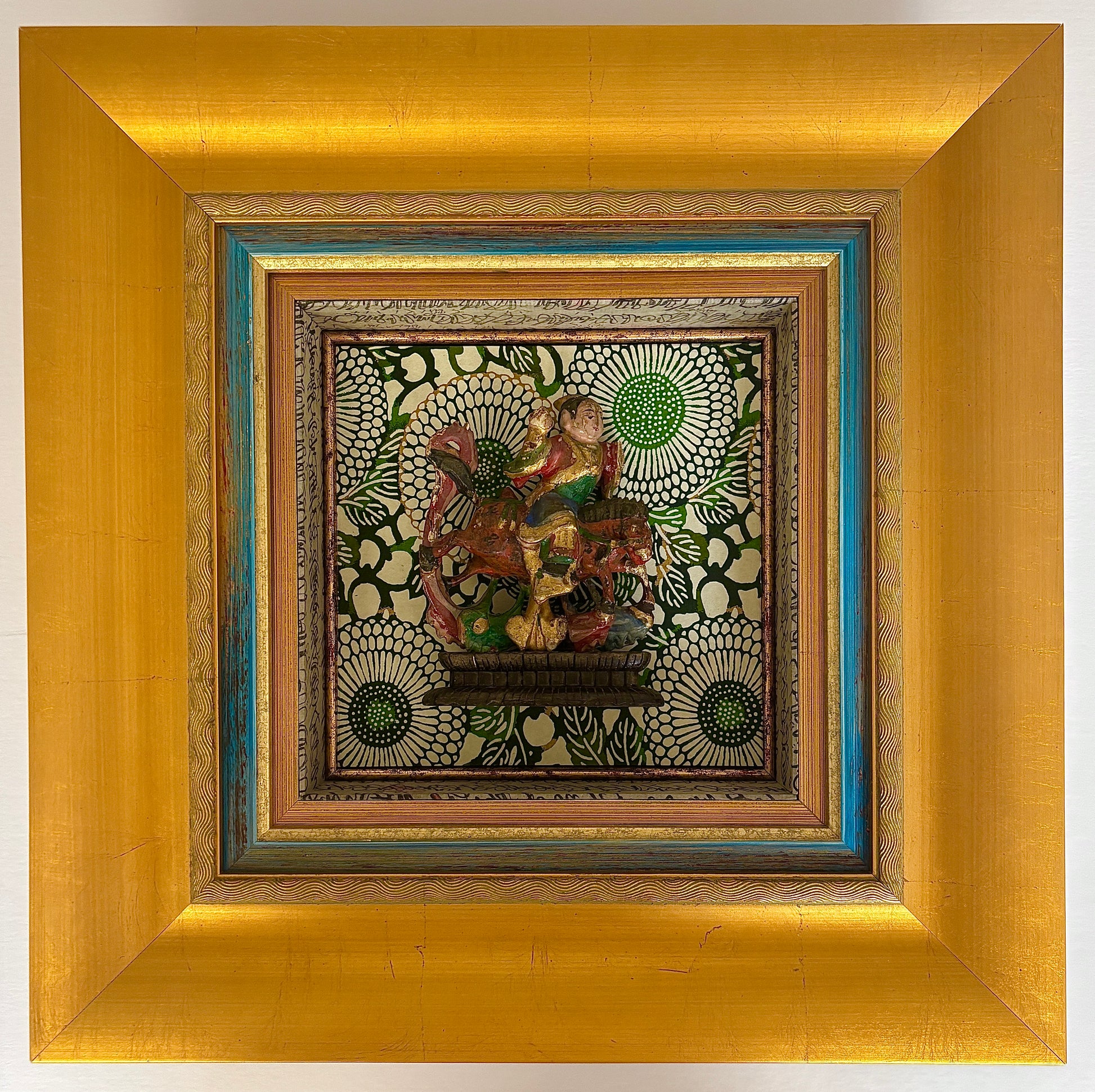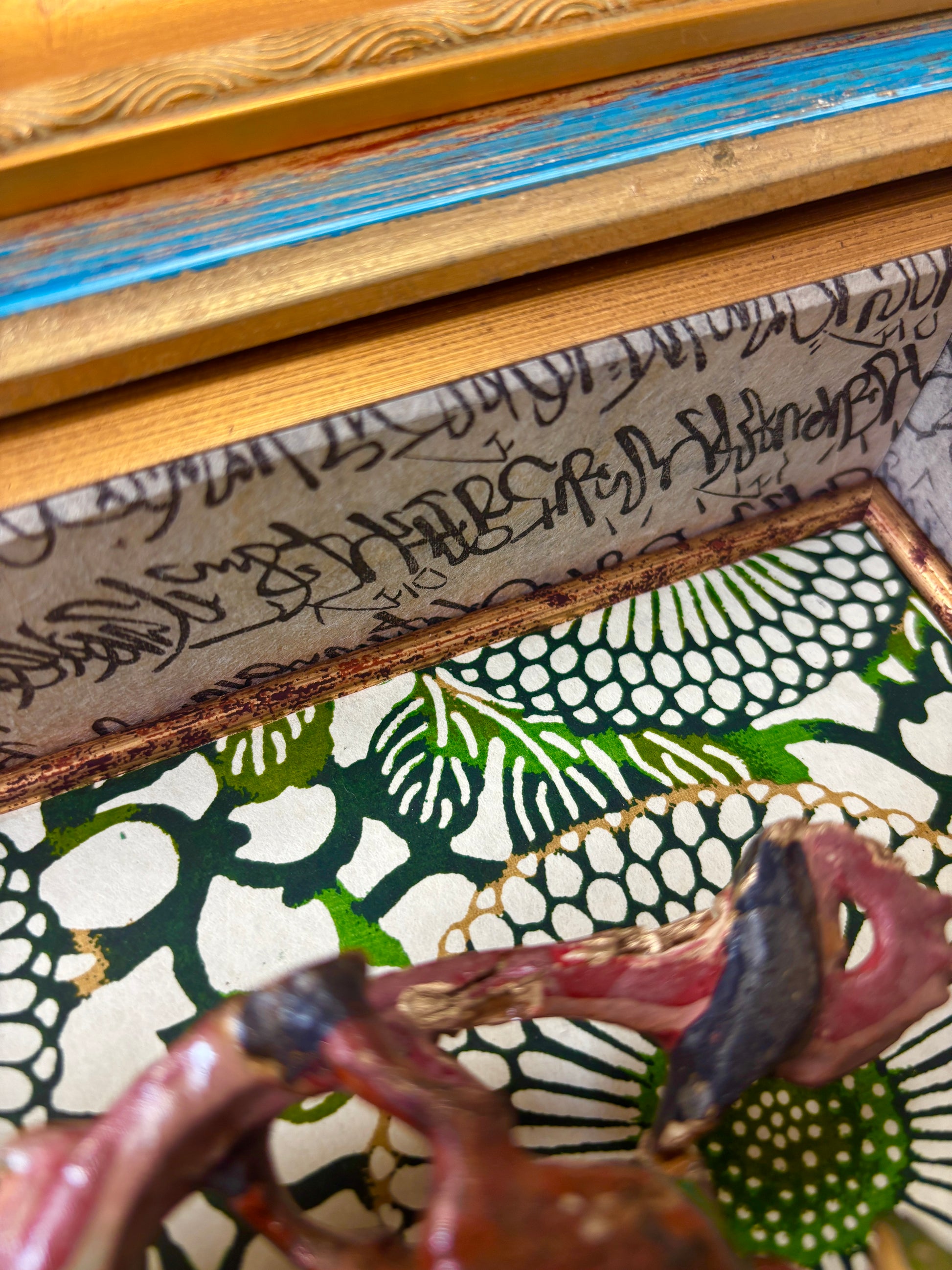 I have added hand made paper and antique Chinese scripted rice pages to form the back and walls of the custom shadow box.