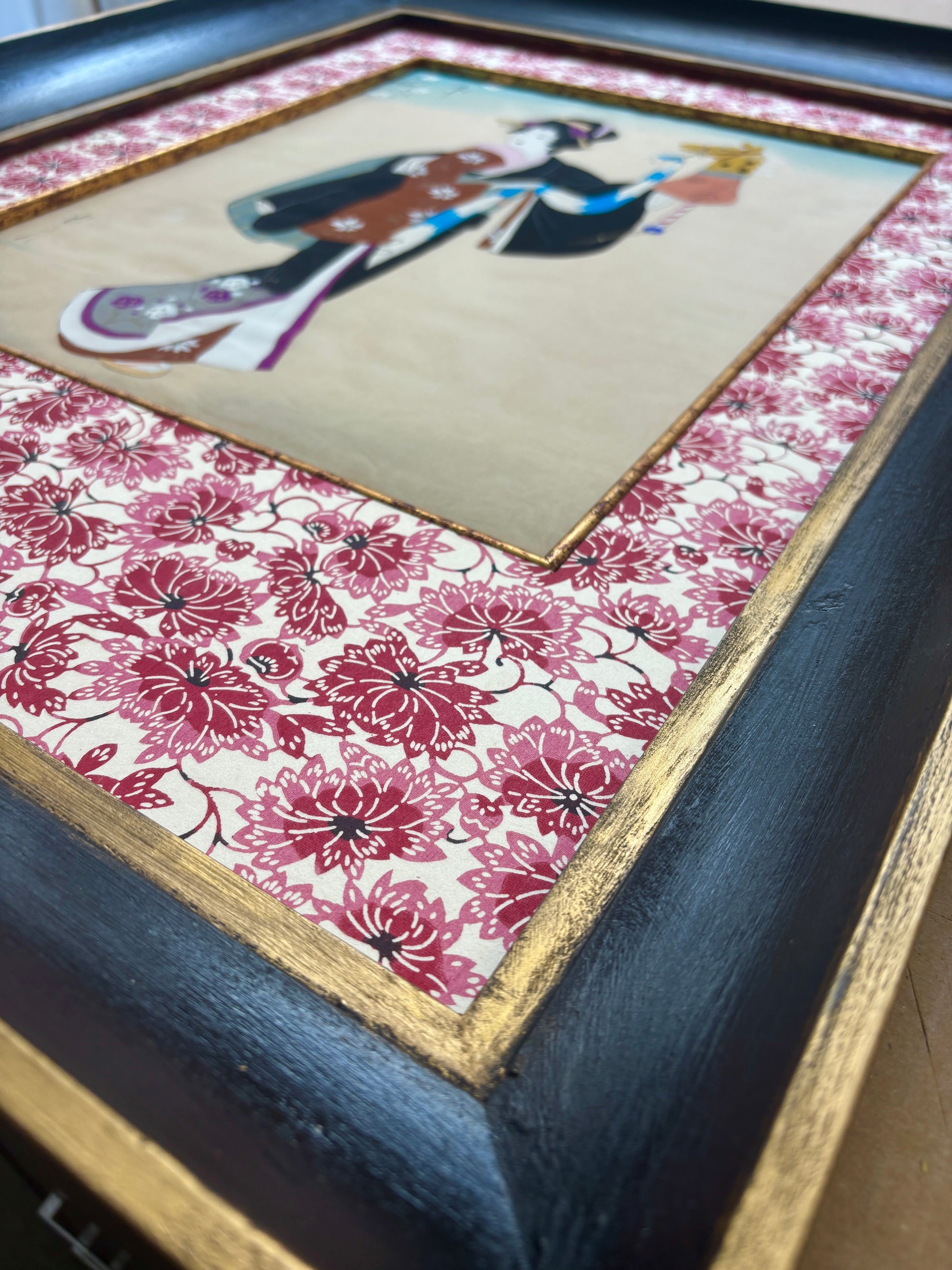 We have added a lovely old hand painted frame in black with gold edging, a distress gold fillet around the silk panel as well as hand made paper in a cherry blossom pattern.
