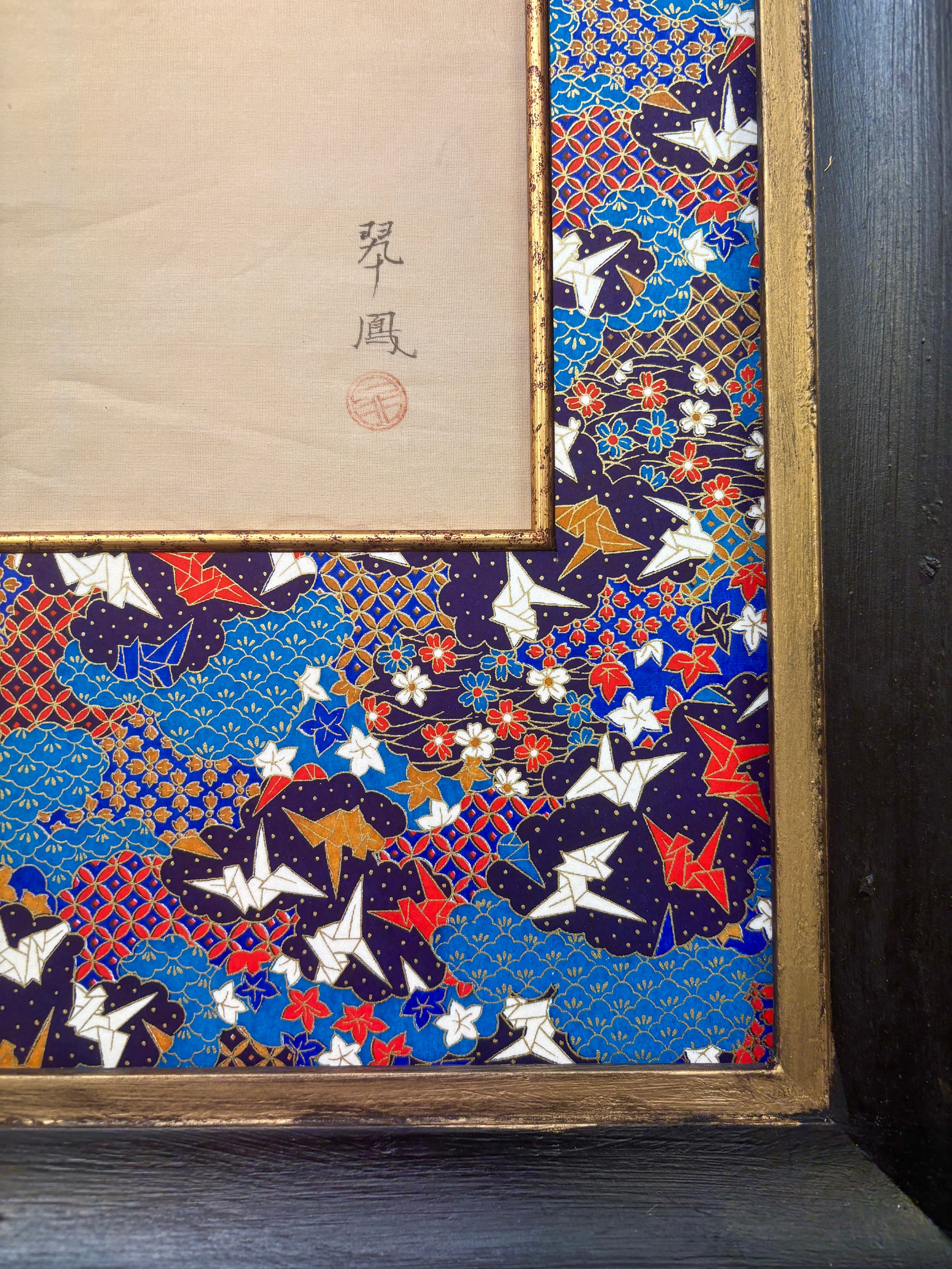 We have added a lovely old hand painted frame in black with gold edging, a distressed gold fillet around the silk panel as well as hand made paper in a bold pattern with tiny cranes.