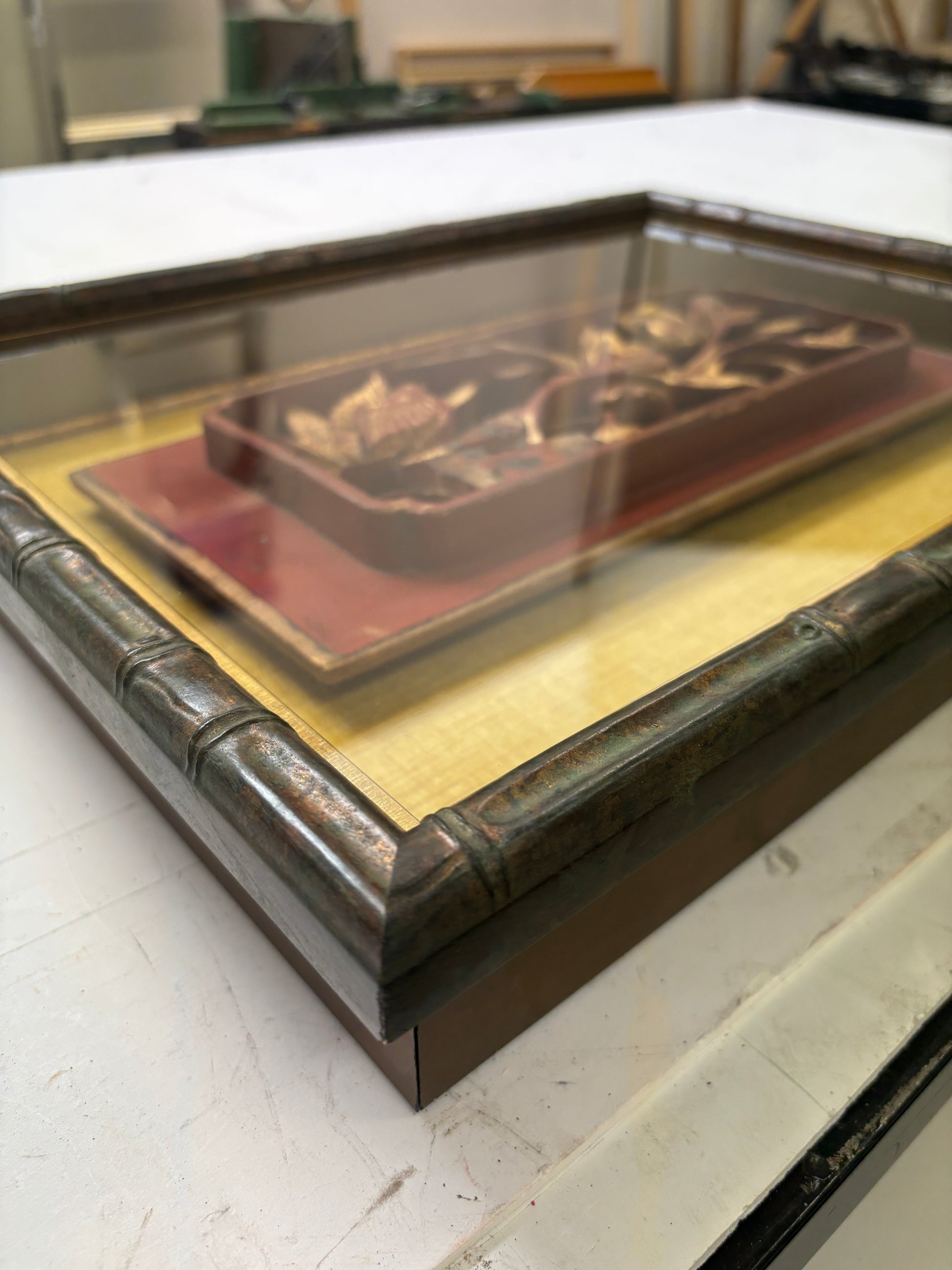 This small Asian carving was once part of a larger design for door panels. Restored in my design studio and paired with a rich fabric background and stacked framing elements.